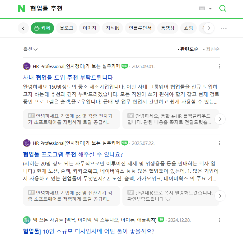 가장 간단한 방법은 업종 관련 키워드로 포털에서 직접 검색해보는 것입니다. 예를 들어 “협업툴 추천”, “기업용 CRM 비교” 같은 키워드를 입력하면, 실제 담당자들이 남긴 질문과 답변을 쉽게 찾아볼 수 있습니다. 이렇게 발견된 질문은 그대로 고객의 고민을 보여주기 때문에, 기업 입장에서는 고객이 어떤 언어를 사용하고 어떤 문제를 중요하게 여기는지 직접 확인할 수 있습니다.