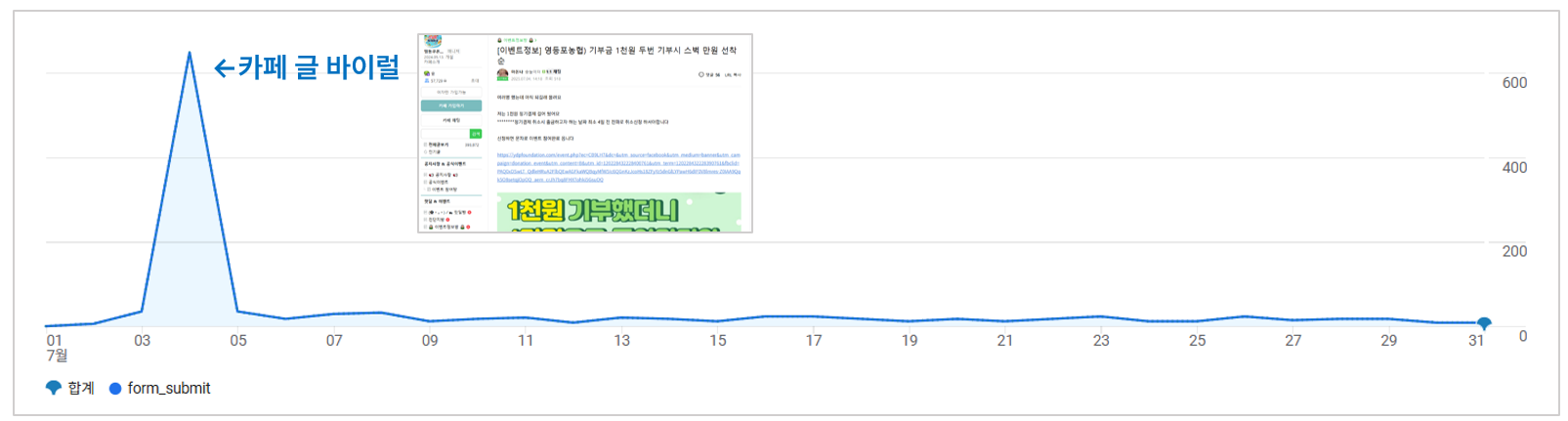 - 성공적인 바이럴 마케팅: 네이버 카페 등 주요 커뮤니티에 캠페인이 자발적으로 공유되었습니다. 이를 통해 단기간에 600명 이상의 기부 참여와 수백 명의 신규 유입을 만들어냈습니다.