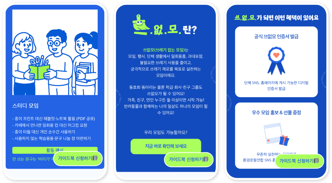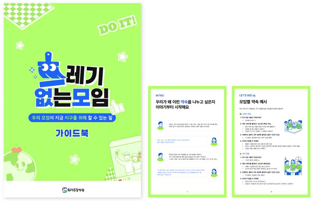 ‘쓰레기 없는 모임’이라는 개념이 대중에게 모호하게 느껴지지 않도록, 구체적인 행동 도구인 실천 가이드북과 단계적인 참여 구조를 설계했습니다.