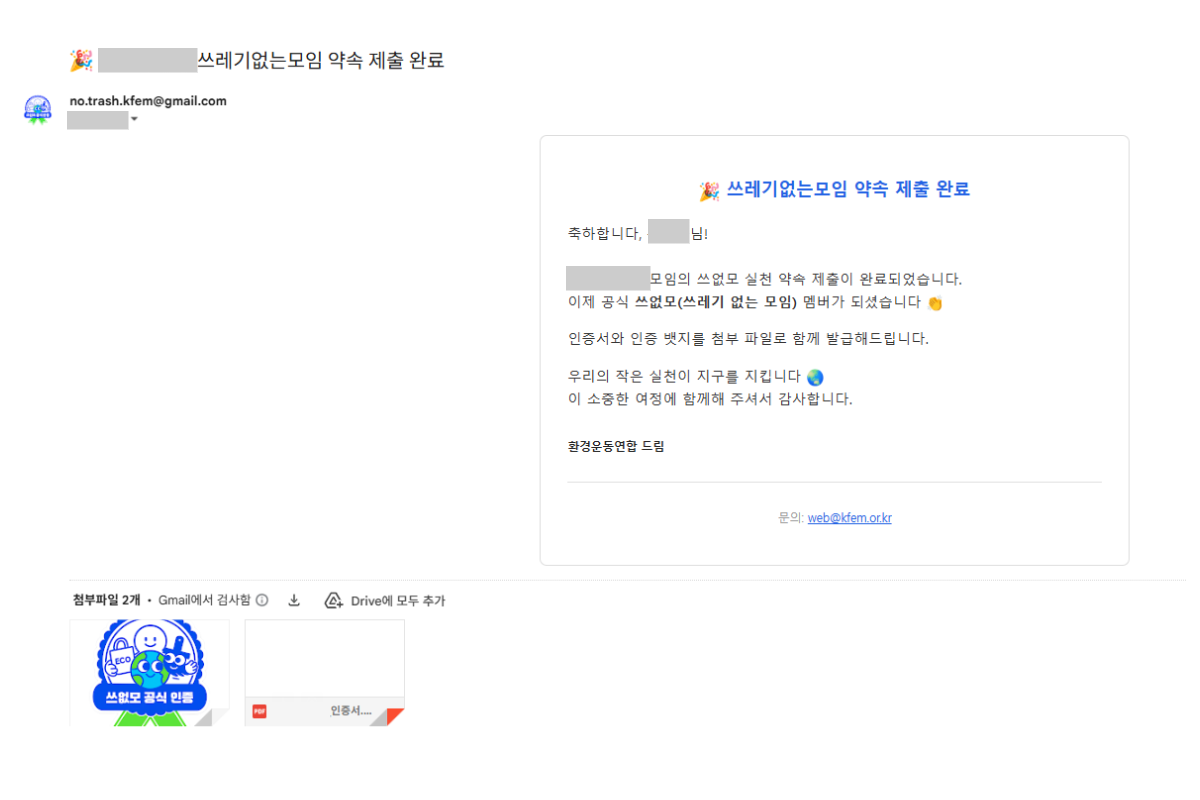 특히 실천 약속을 제출한 모임에는 공식 인증서와 인증 뱃지를 발급하여 SNS 등에 우리 모임의 가치 있는 활동을 공유할 수 있게 하였습니다 이러한 인증 요소는 환경운동연합과의 유대감을 강화할 뿐만 아니라, 최종 단계인 실천 약속 제출까지 완주하도록 유도하는 동기부여 장치로 작용했습니다.
